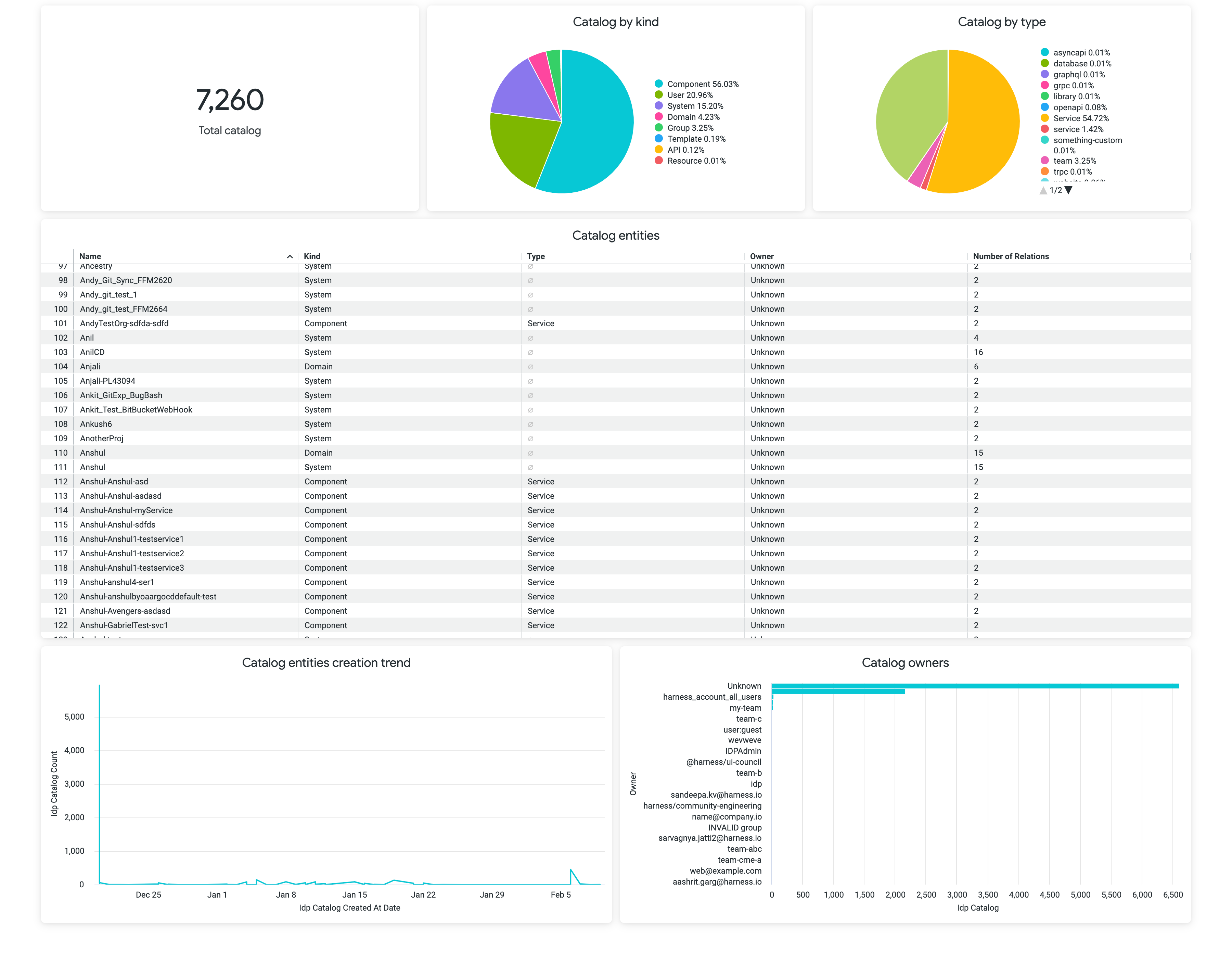 - Dashboard describing the state of catalog, which includes, Number of registered entities, catalog kind and type.