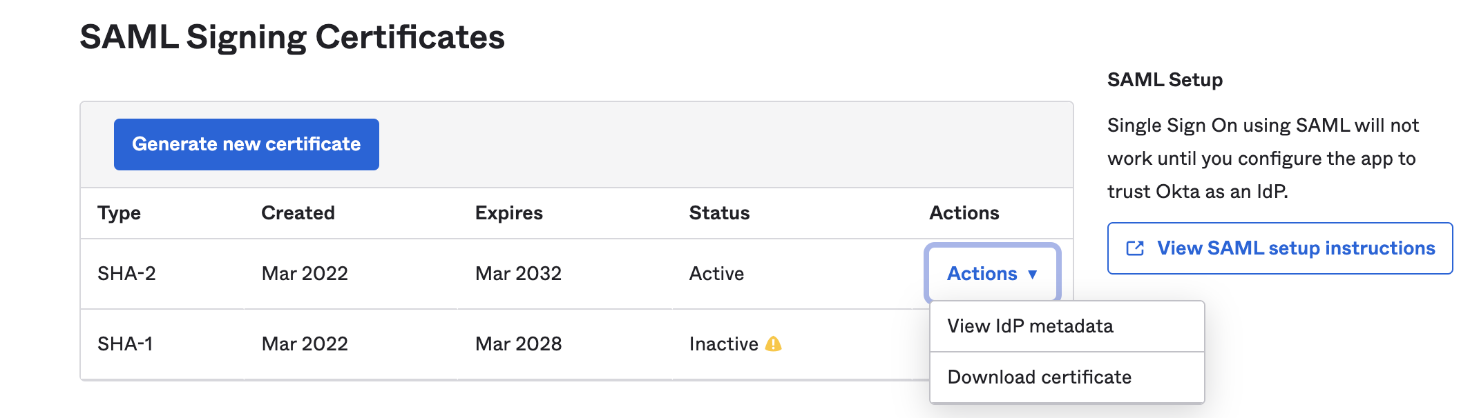 Select Actions to download the SAML metadata file.