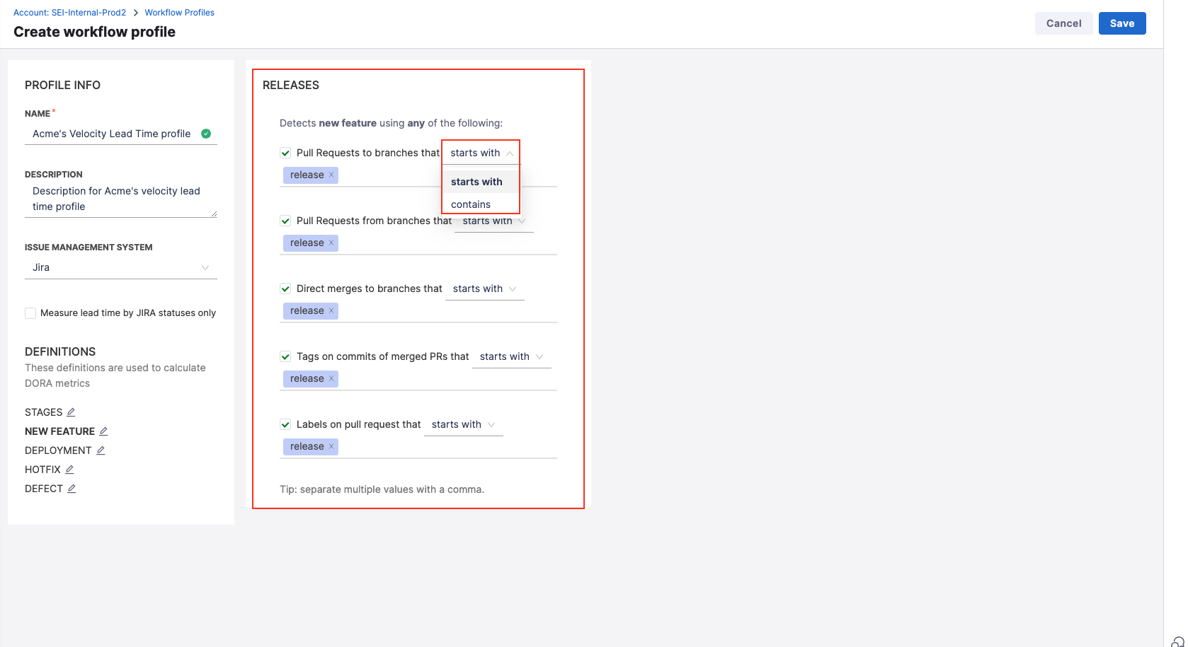 - For new profiles, the release stage is disabled by default. Enable it by selecting the checkbox to measure lead time using Jira statuses.